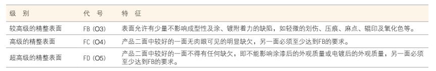 針對(duì)國(guó)內(nèi)鋼廠無法生產(chǎn)超高級(jí)精整表面質(zhì)量鋼板(O5板)的現(xiàn)狀,寶鋼積極組織生產(chǎn)、科研方面的人員大力攻關(guān),在國(guó)內(nèi)首先開發(fā)出了O5板這一冷軋精品,并實(shí)現(xiàn)了穩(wěn)定批量供貨,極大地滿足了汽車用戶的需求。目前寶鋼生產(chǎn)的低碳及超低碳鋼板不僅被廣泛地用于制作汽車的內(nèi)部零件,而且還被大量用作表面質(zhì)量要求高的轎車及客車等汽車的外覆蓋件。鋼板表面質(zhì)量分為三個(gè)級(jí)別,以滿足不同用途的要求。如下表所示: